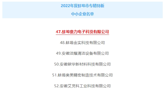 為積極響應(yīng)《蚌埠市智能工廠/數(shù)字化車間認(rèn)定管理辦法》《蚌埠市重大技術(shù)裝備首臺(tái)(套)認(rèn)定管理辦法》《蚌埠市工業(yè)設(shè)計(jì)中心認(rèn)定管理辦法》《蚌埠市綠色工廠評(píng)價(jià)管理暫行辦法》《蚌埠市服務(wù)型制造示范企業(yè)認(rèn)定管理辦法(試行)》等文件規(guī)定,經(jīng)我司積極申報(bào)申報(bào),縣區(qū)初審?fù)扑],相關(guān)部門審核,專家評(píng)審,征求意見以及公示等環(huán)節(jié)市經(jīng)濟(jì)和信息化局研究確定,蚌埠鼎力電子科技有限公司被認(rèn)定為2022年度蚌埠市“專精特新”中小企業(yè)。